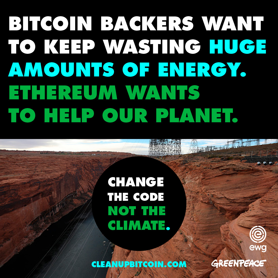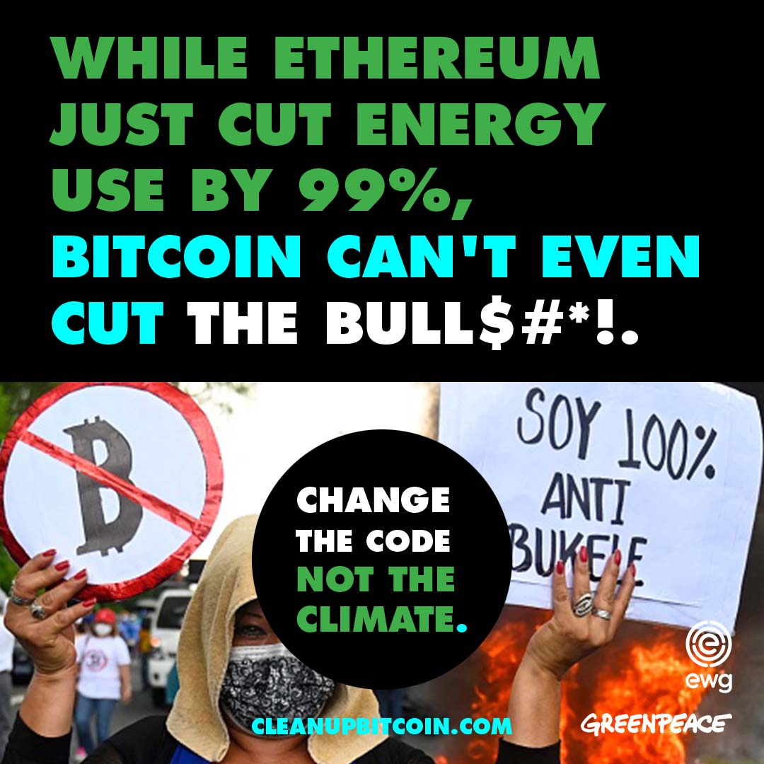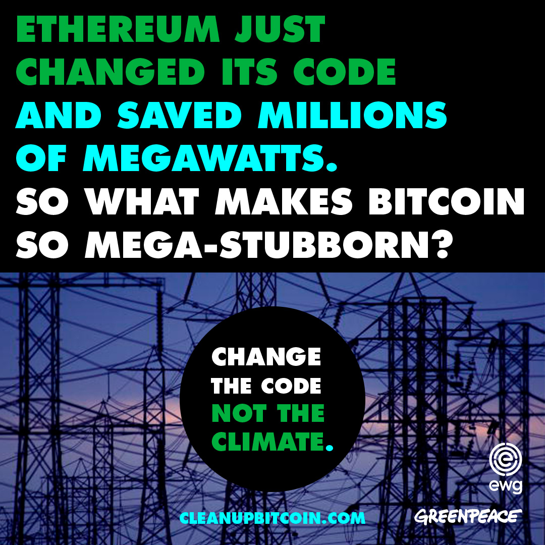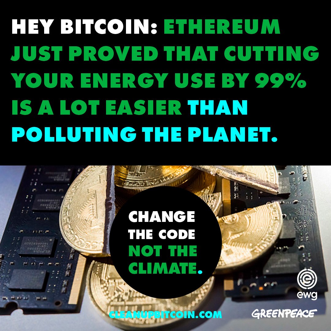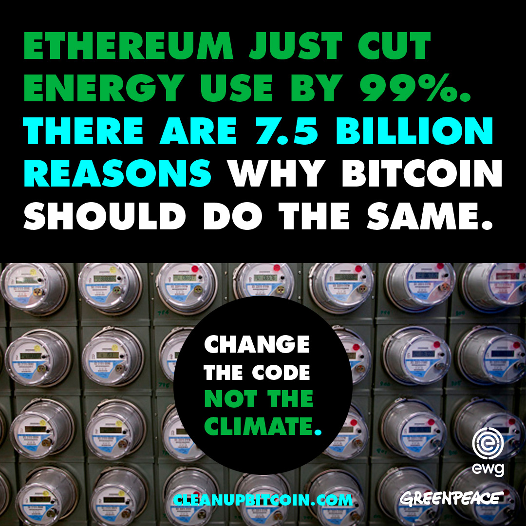 Ethereum, the second largest cryptocurrency, just slashed its electricity use by 99.95%, proving that a code change is technically and politically possible. Ethereum's Merge leaves Bitcoin as the largest cryptocurrency climate polluter. It doesn't have to be this way.
